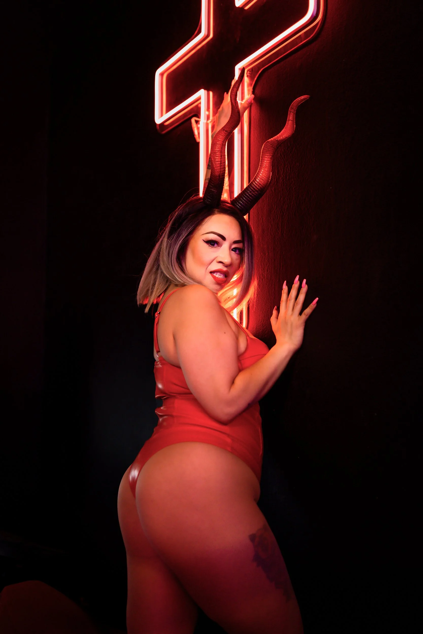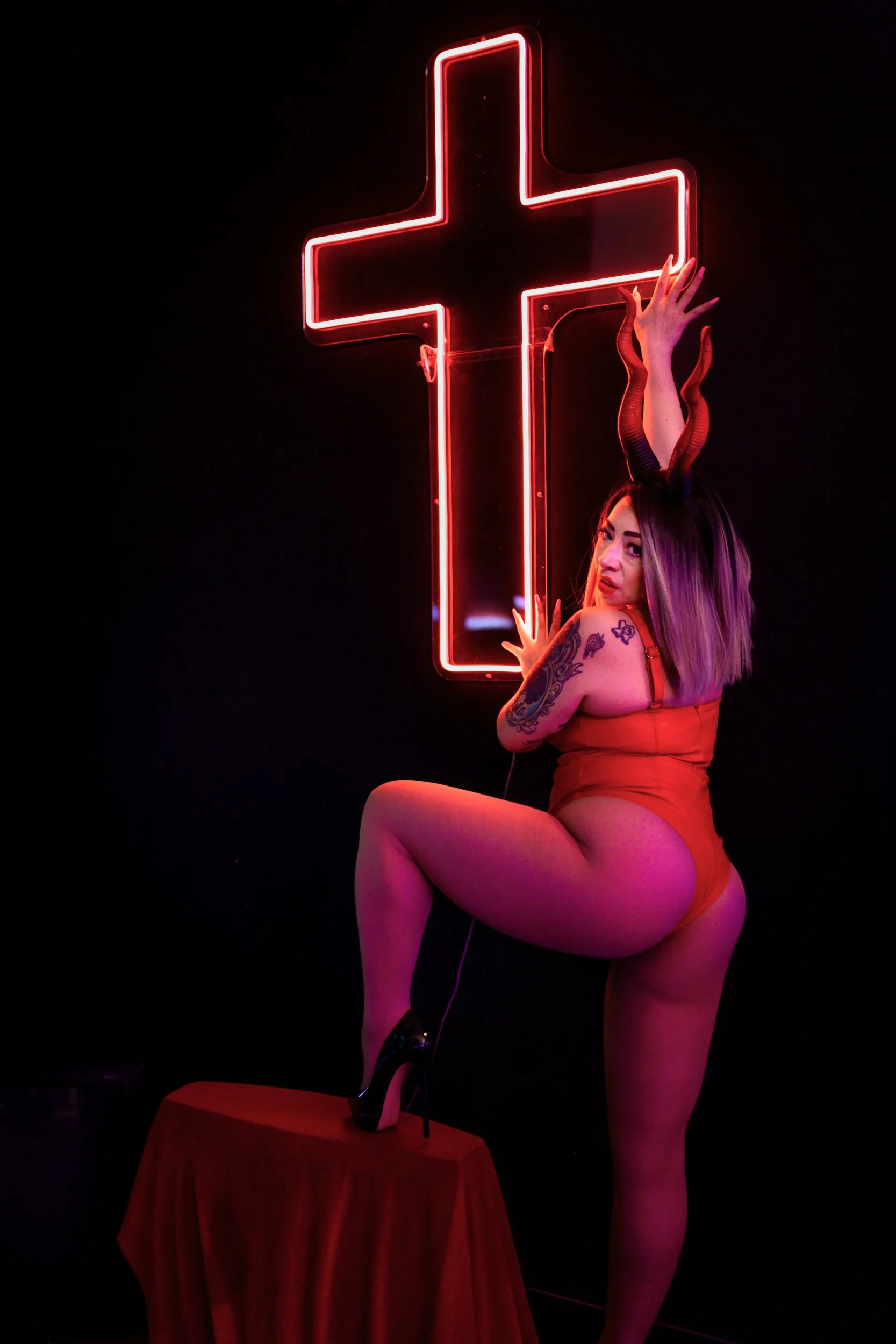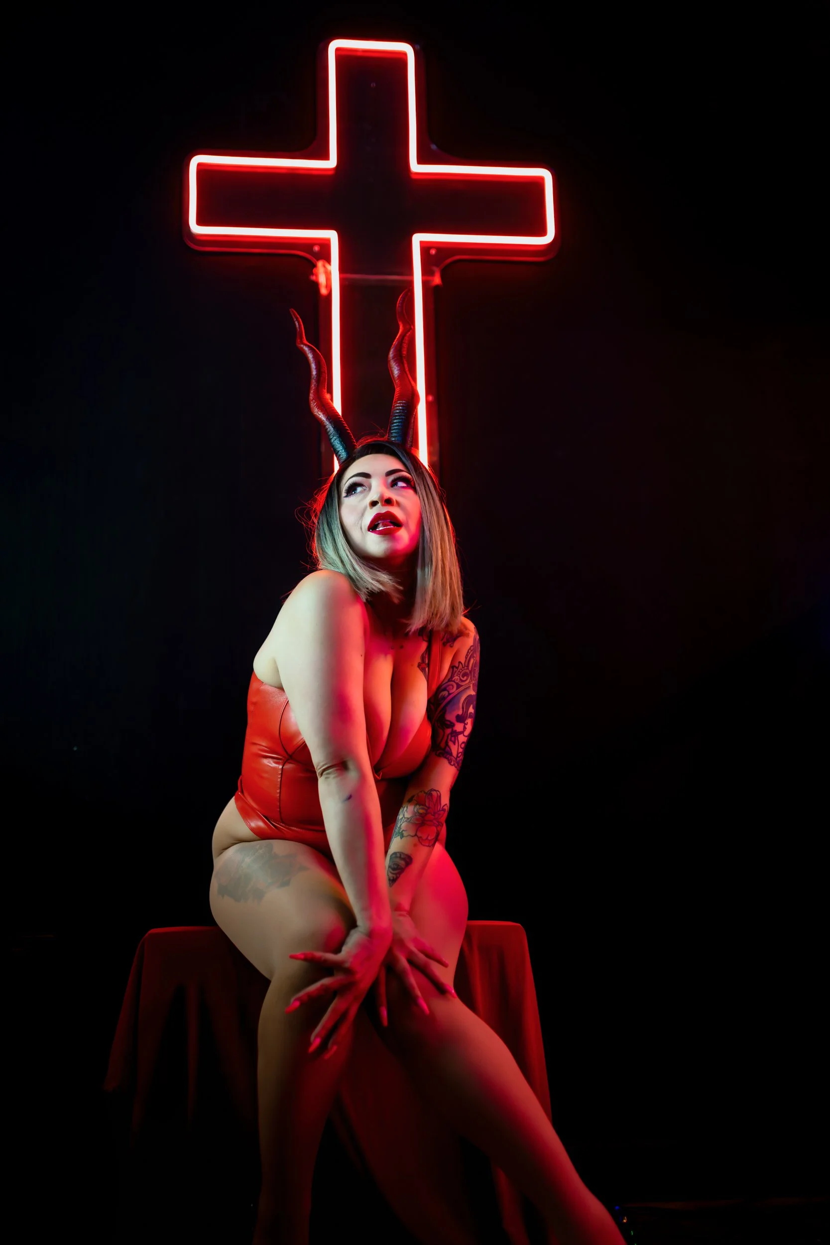 The second segment of our shoot was nothing short of epic. We moved to a set bathed in the intense glow of red lighting from a neon red cross. Lola, dressed in a red outfit that matched the lighting perfectly, added a pair of devilish horns for an extra edge. The combination of the red hues and her daring attire created a series of powerful and visually captivating images. The red cross's lighting cast dramatic shadows and highlights that emphasized her fierce expression and bold stance, making this part of the shoot particularly memorable.