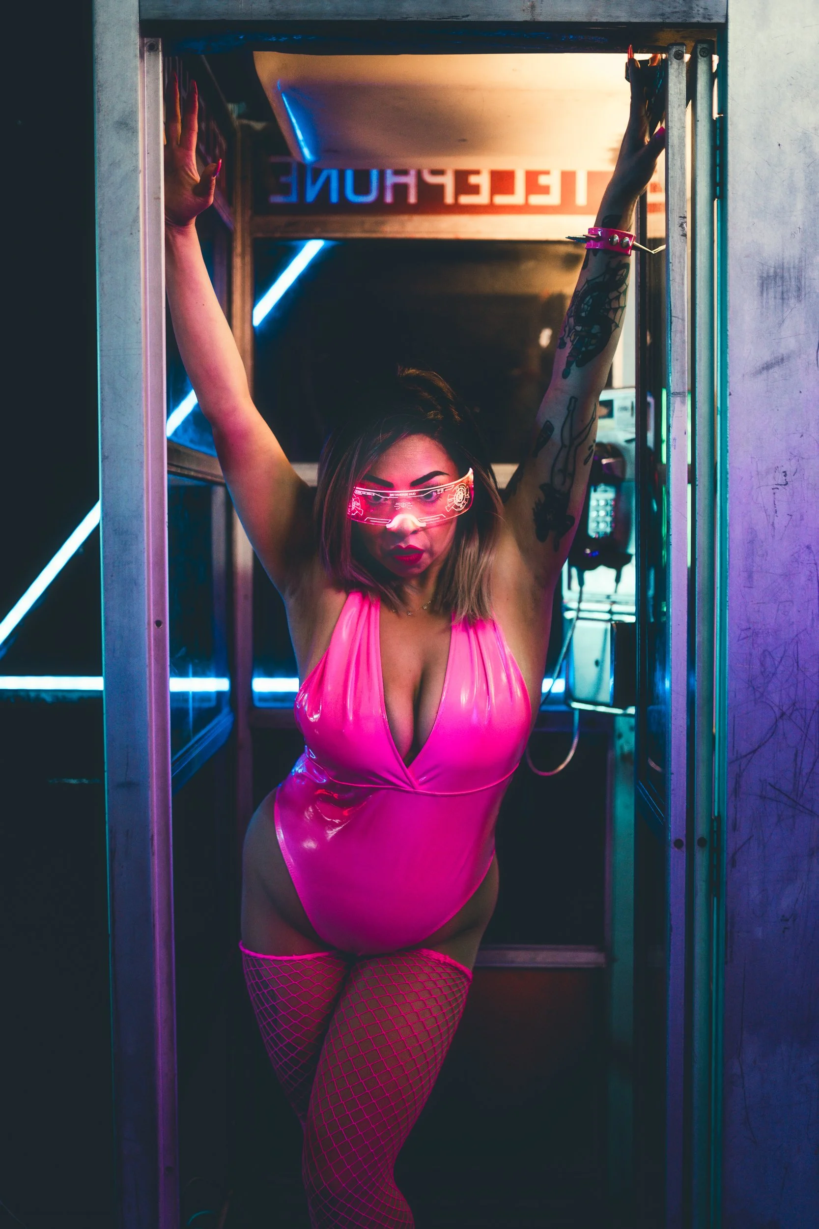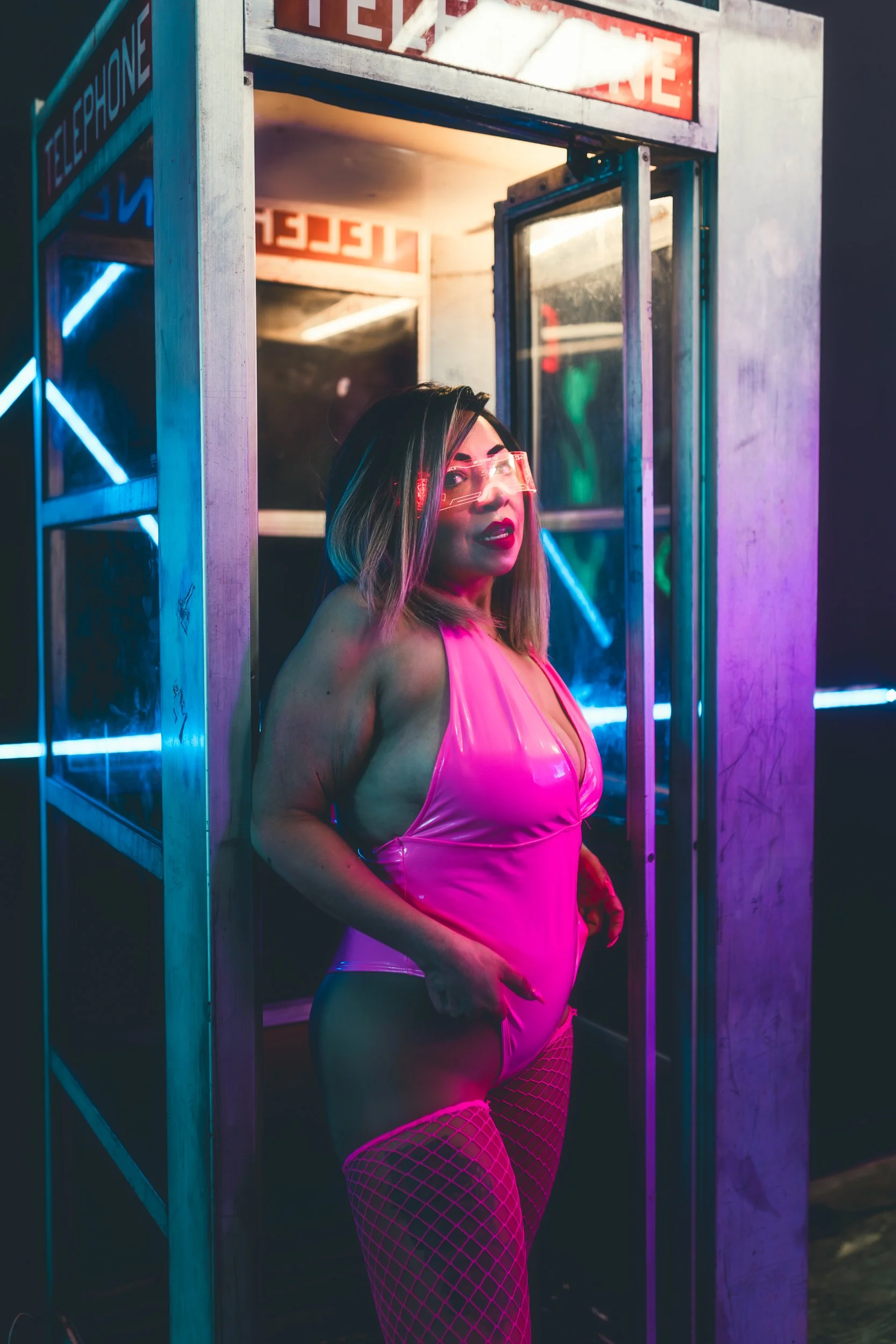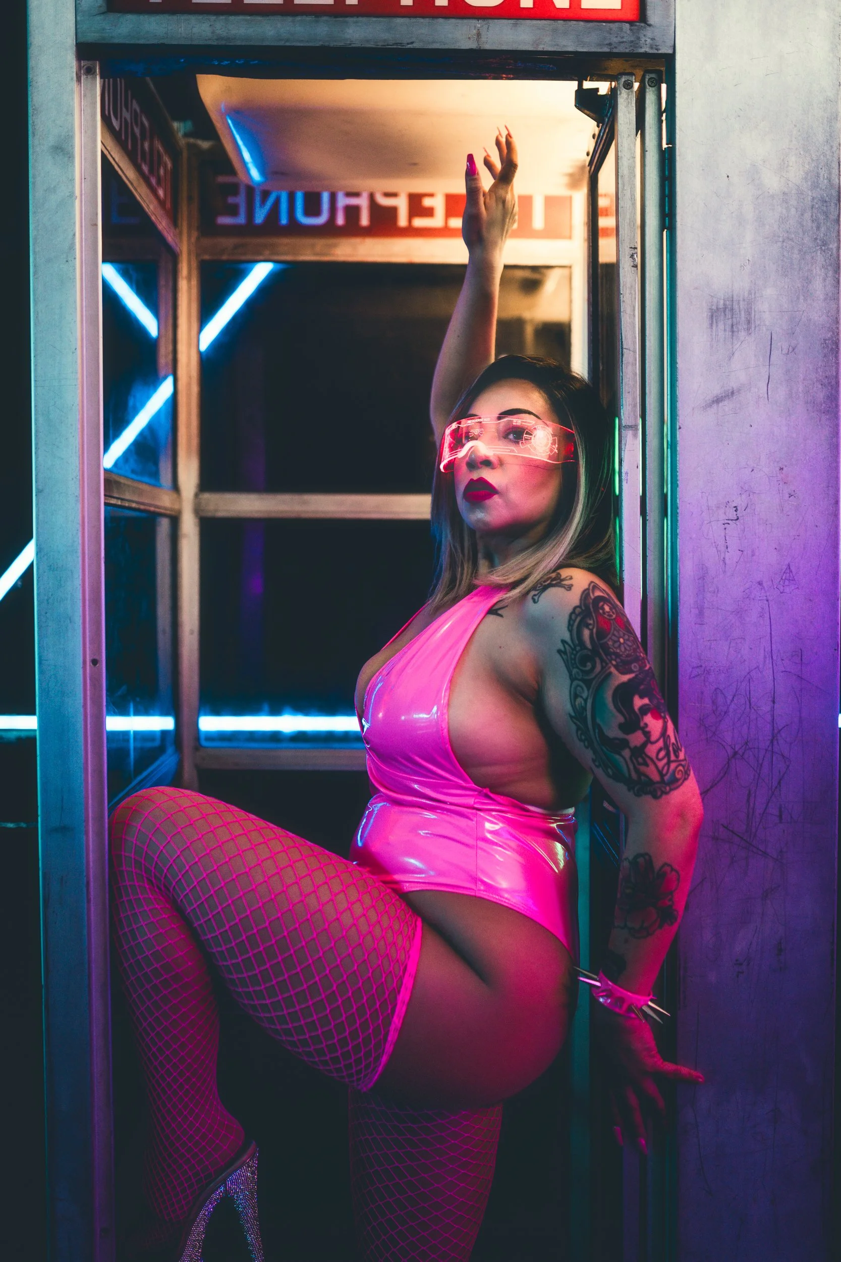 Next, we transitioned to a phone booth setup that was both nostalgic and futuristic. Using an old, outdated piece of technology as the frame, we juxtaposed it with modern, edgy aesthetics. Lola's natural charisma shone through as she effortlessly posed within the confines of the booth, creating a compelling contrast between the vintage element and her contemporary style. The photos from this part of the shoot have a unique charm, blending the past and the future in a way that feels both innovative and timeless.